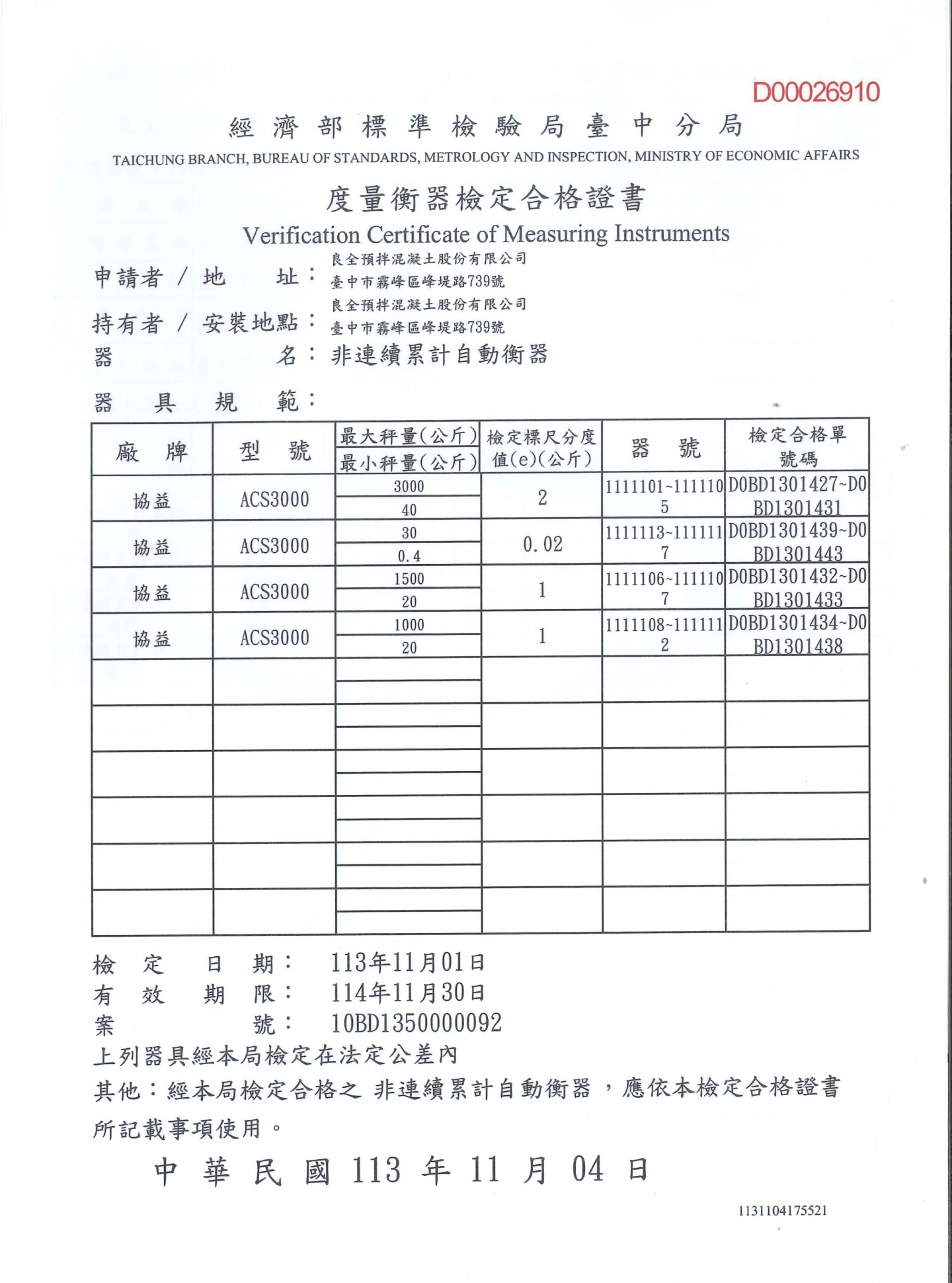 度量衡器檢定合格證書