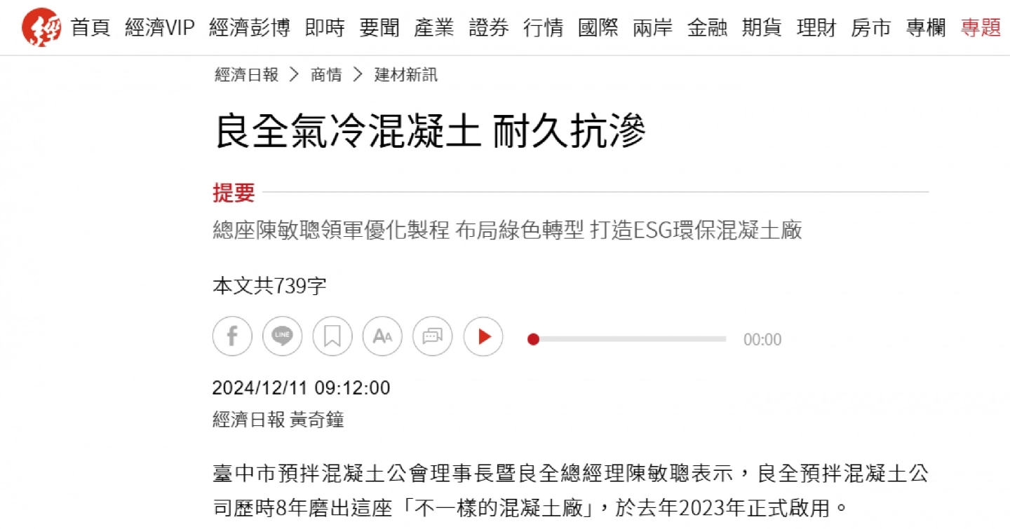 經濟日報 | 良全氣冷混凝土 耐久抗滲